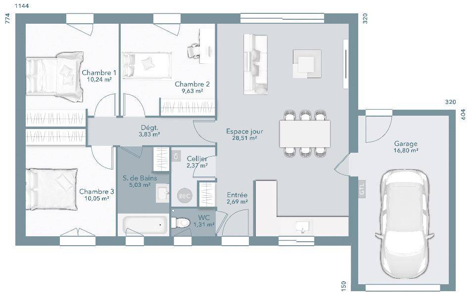 Cette maison de plain-pied est l'option idéale pour un premier achat sans compromis sur la qualité. Elle propose 3 chambres, un agencement optimisé, et une pièce de vie conviviale de plus de 30 m². La construction est conforme à la RE2020, vous assurant des performances énergétiques maximales et des charges minimales.