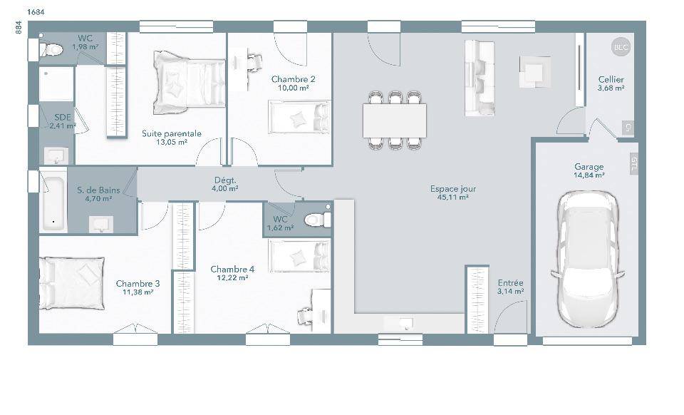 Avec sa façade sobre et élégante, cette maison est conçue de manière ingénieuse et fonctionnelle, les volumes sont optimisés pour que chaque membre de la famille puisse avoir son propre cocon. Le grand volume de l'espace de vie dessert la cuisine, le salon et la salle à manger, on retrouve également un cellier et un garage pour la zone jour. Du côté nuit, ce plan vous propose 3 chambres, une salle de bains et une chambre parentale avec salle d'eau et dressing privés en option.