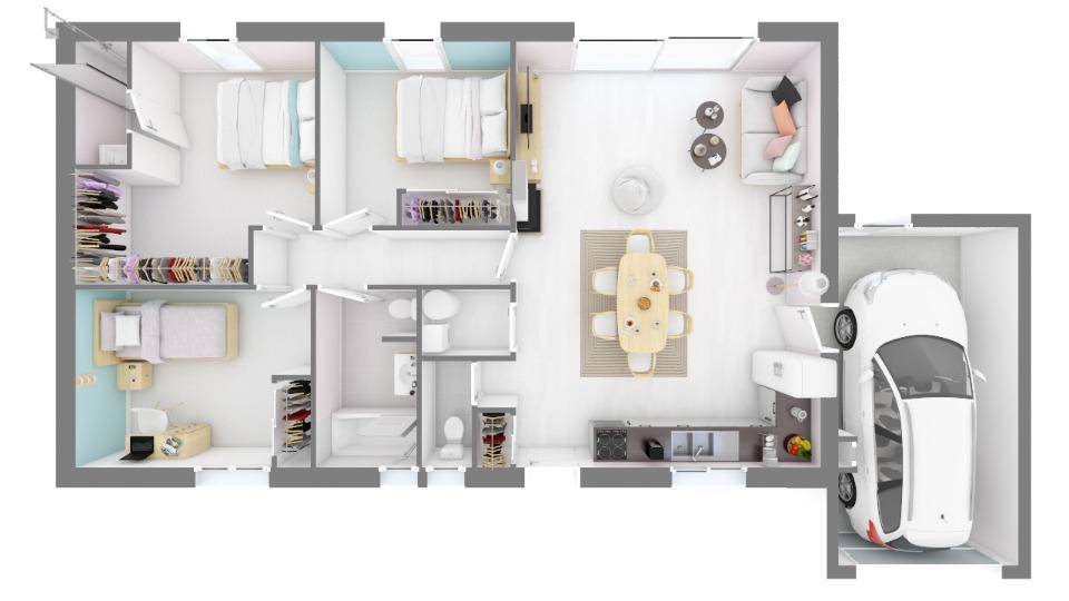 Vous souhaitez faire construire une maison de plain-pied en RE2020? Optez pour le modèle Actua 95 ! Dans ses 95 m² habitables, on retrouve 4 belles chambres de plus de 10 m², une salle de bains, un cellier et un vaste espace jour de près de 40 m² pour accueillir votre cuisine, votre salon et votre salle à manger ! Autre atout de ce modèle Maisons France Confort Sud, l'avancée du garage en option de près de 17 m² apporte une dynamique à la façade.