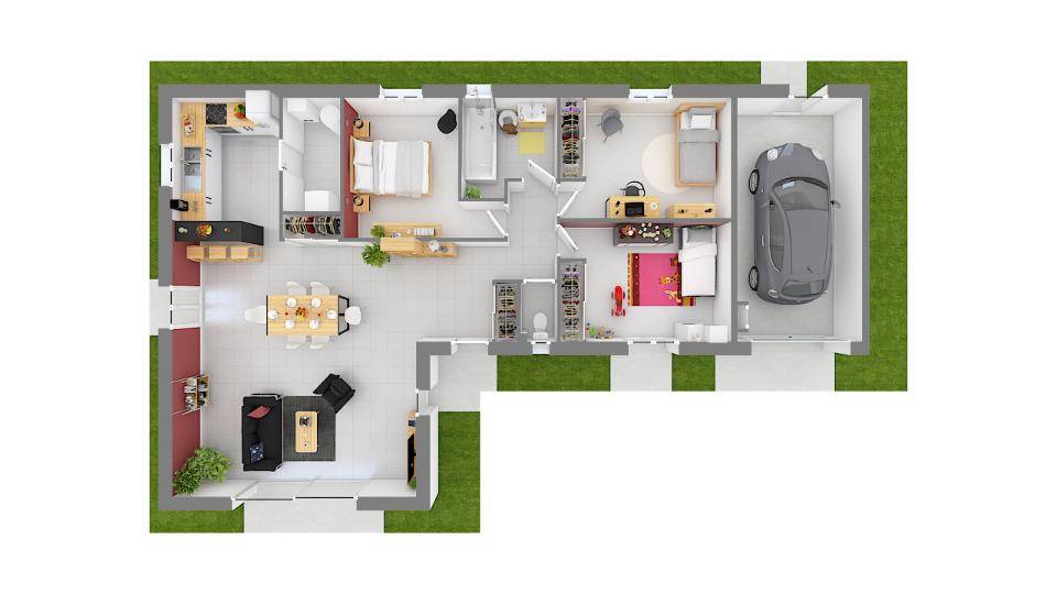 Elle inclut trois chambres, une cuisine et une salle de bains. La maison est neuve.