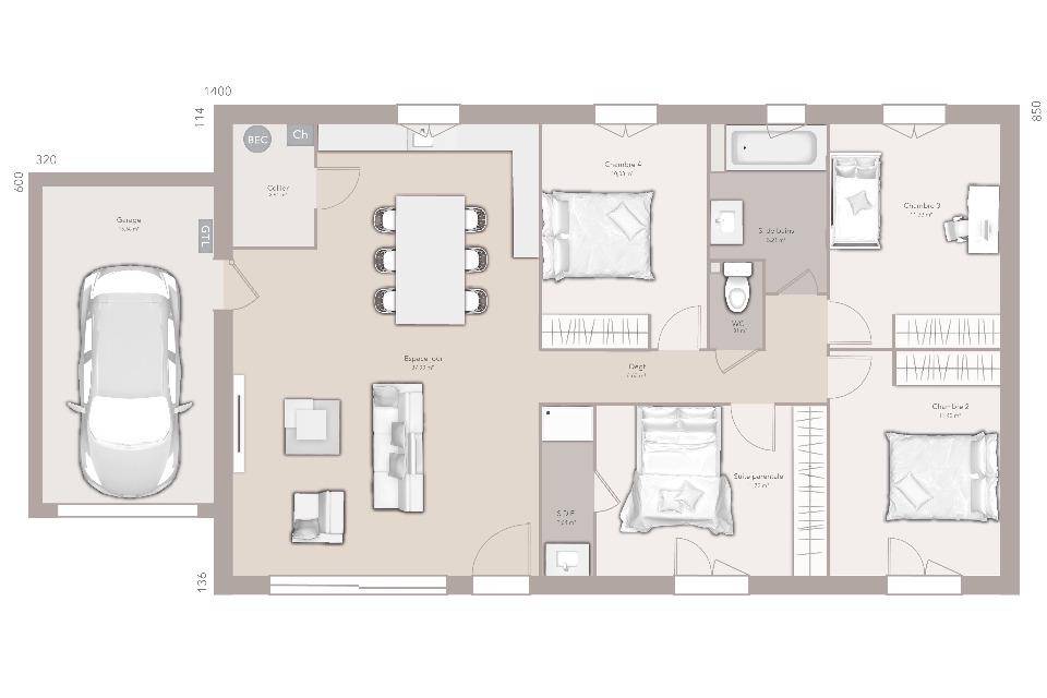 Conçue de plain-pied, elle inclut quatre chambres, une cuisine et deux salles de bains. Cette maison est neuve.
