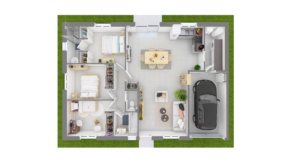 Conçue de plain-pied, elle dispose de trois chambres, d'une cuisine et de deux salles de bains. Cette maison est neuve.