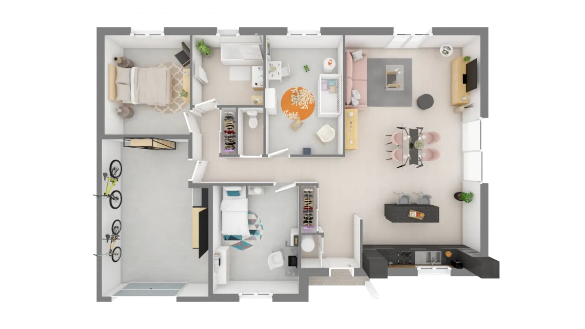 L’organisation intérieure est pensée pour votre confort, avec un espace jour et un espace nuit bien séparés. Les chambres donnent sur un dégagement, garantissant tranquillité et intimité. La pièce de vie, très lumineuse, avec cuisine ouverte, offre des dimensions généreuses, idéales pour recevoir famille et amis. De plus, le garage intégré vous apportera un espace de rangement supplémentaire et pratique.