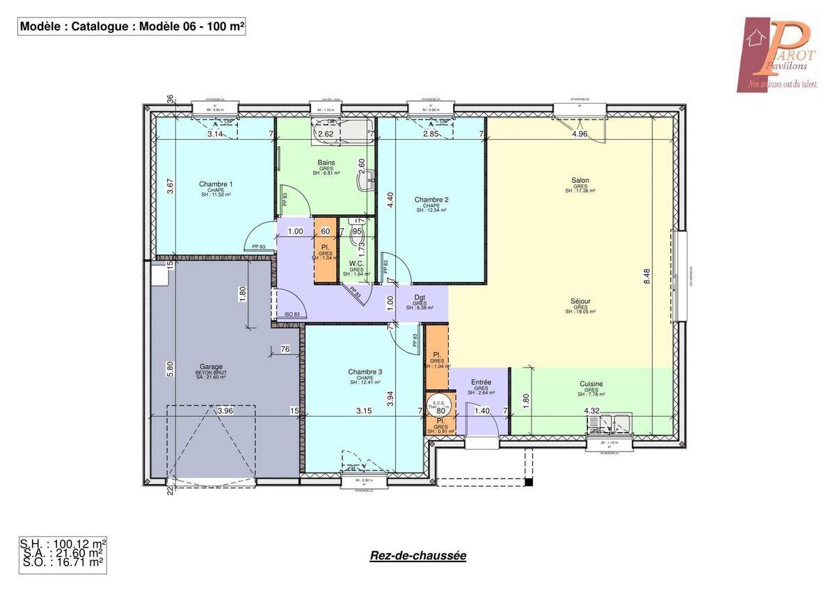 TERRAIN ET MAISONSur ce terrain, nous vous proposons cette maison neuve, le modèle Mirabelle, construite par Pavillons Parot. Cette belle demeure de standing au look élégant et design saura vous séduire par ses nombreuses qualités.Avec une surface de 100 m², cette maison de plain-pied dispose de 3 chambres et de 4 pièces, offrant ainsi un espace de vie fonctionnel et facile à vivre. Le porche d’entrée avec colonne confère à sa façade un aspect original et accueillant, tandis que son très beau toit habillé de tuiles en terre cuite H10 ajoute une touche de charme supplémentaire.L’organisation intérieure est pensée pour votre confort, avec un espace jour et un espace nuit bien séparés. Les chambres donnent sur un dégagement, garantissant tranquillité et intimité. La pièce de vie, très lumineuse, avec cuisine ouverte, offre des dimensions généreuses, idéales pour recevoir famille et amis. De plus, le garage intégré vous apportera un espace de rangement supplémentaire et pratique.Cette maison neuve est basse consommation et conforme à la RE2020, ce qui en fait une habitation moderne et économique. Vous bénéficierez de très bonnes performances énergétiques, pour une maison douillette et très confortable.Laissez-vous tenter par le modèle Mirabelle, une nouveauté dans notre catalogue qui ne vous décevra pas?!