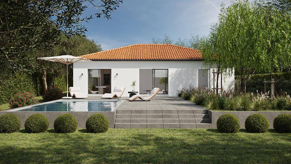 La maison Verdania se distingue par son plan en L et sa toiture à faible pente à 4 pans, offrant une esthétique contemporaine et élégante. Dès l'entrée, un porche accueillant vous mène à un vaste séjour lumineux, agrémenté de baies coulissantes qui inondent l'espace de lumière naturelle. La configuration en L permet une séparation intelligente des espaces de vie et de nuit, garantissant confort et intimité.