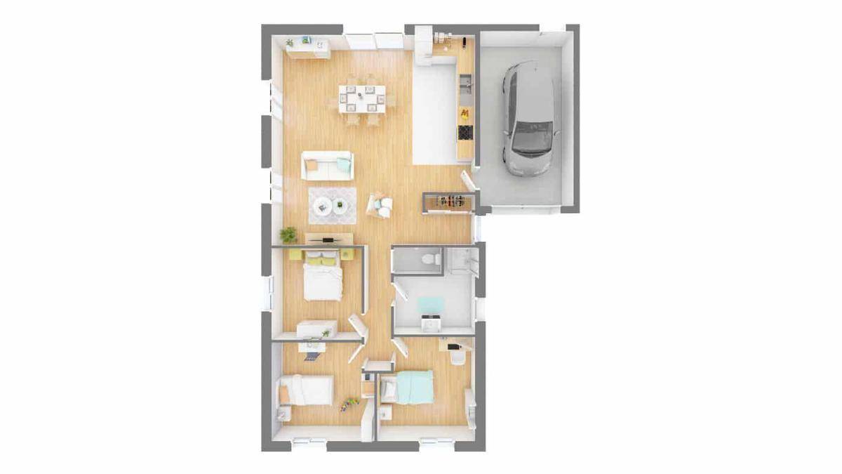 Vous apprécierez la porte communicante avec le garage intégré, vous évitant d’affronter les éléments lorsque vous vous y rendrez. Le plan en L personnalisable, plébiscité par un grand nombre, et le choix entre un toit à 2 pans ou à 4 pans, vous permettront de créer la maison de vos rêves.