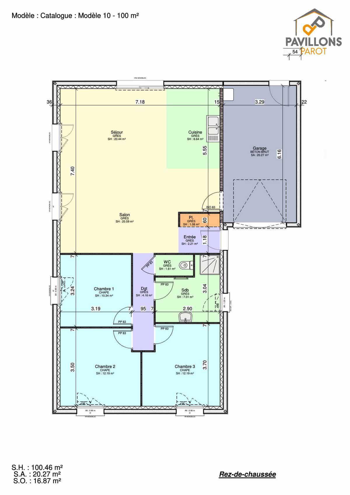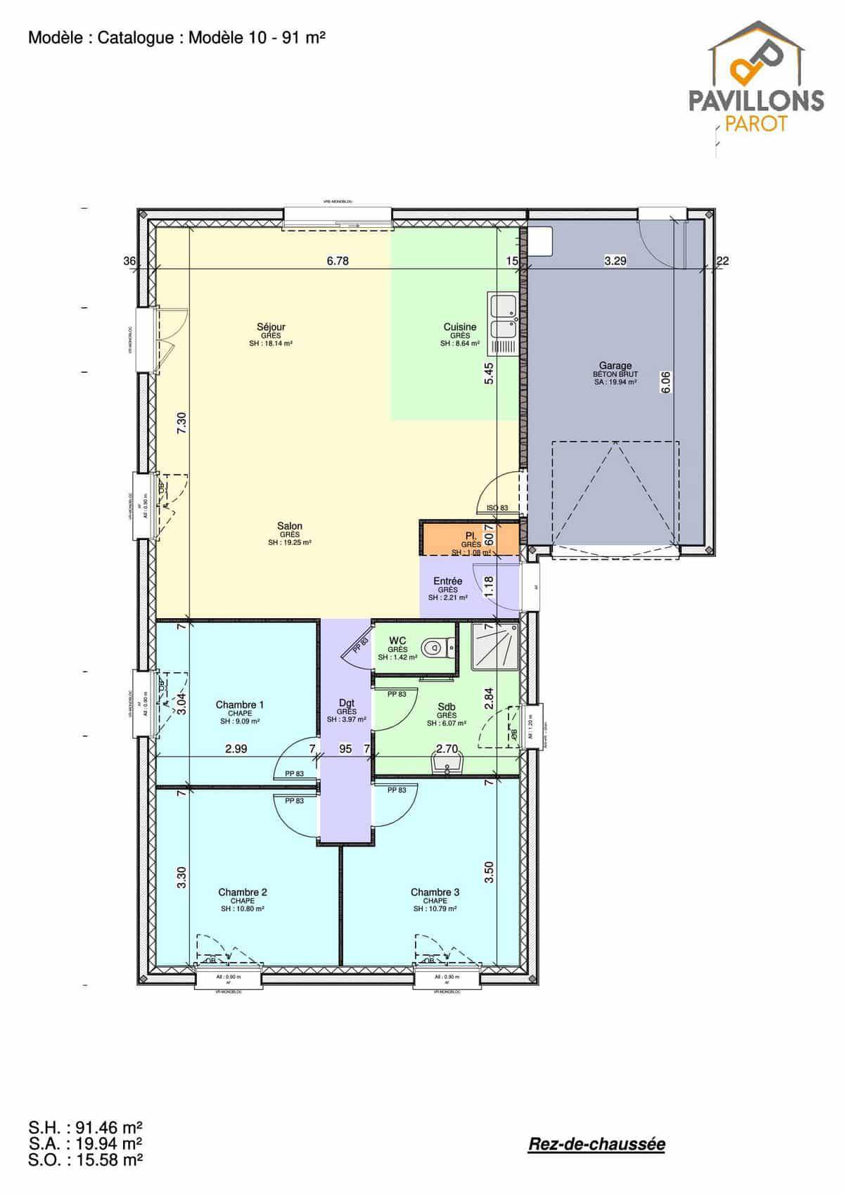 TERRAIN ET MAISONSur ce terrain, nous vous proposons cette maison neuve, le modèle Mirabelle, construite par Pavillons Parot. Cette belle demeure de standing au look élégant et design saura vous séduire par ses nombreuses qualités.Avec une surface de 100 m², cette maison de plain-pied dispose de 3 chambres et de 4 pièces, offrant ainsi un espace de vie fonctionnel et facile à vivre. Le porche d’entrée avec colonne confère à sa façade un aspect original et accueillant, tandis que son très beau toit habillé de tuiles en terre cuite H10 ajoute une touche de charme supplémentaire.L’organisation intérieure est pensée pour votre confort, avec un espace jour et un espace nuit bien séparés. Les chambres donnent sur un dégagement, garantissant tranquillité et intimité. La pièce de vie, très lumineuse, avec cuisine ouverte, offre des dimensions généreuses, idéales pour recevoir famille et amis. De plus, le garage intégré vous apportera un espace de rangement supplémentaire et pratique.Cette maison neuve est basse consommation et conforme à la RE2020, ce qui en fait une habitation moderne et économique. Vous bénéficierez de très bonnes performances énergétiques, pour une maison douillette et très confortable.Laissez-vous tenter par le modèle Mirabelle, une nouveauté dans notre catalogue qui ne vous décevra pas?!