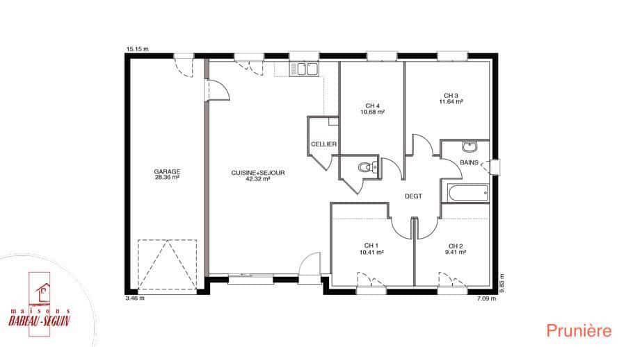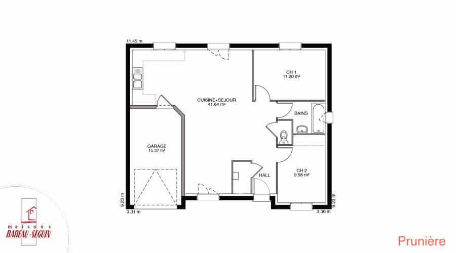 Sur ce terrain, nous vous proposons cette maison neuve, modèle Prunière, l’un des modèles les plus vendus par Babeau-Seguin, constructeur offrant le meilleur rapport qualité/prix du marché. Figurant dans le top 5 des maisons individuelles Babeau-Seguin, cette maison plain-pied Prunière séduit par son renfoncement qui casse la monotonie de la façade avant et offre un abri de seuil.