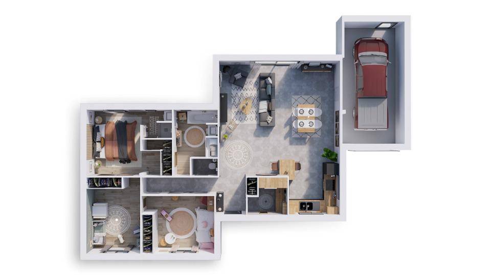 À l'intérieur, l'espace jour est adroitement séparé de la partie nuit, pour davantage de tranquillité et d'intimité. Lumineuse et spacieuse, la pièce de vie dévoile une belle hauteur sous plafond et permet d'aménager un coin salon, une salle à manger ainsi qu'une cuisine ouverte, apportant l'esprit convivial voulu par cette maison individuelle. Un cellier et un large garage attenant offrent de la surface supplémentaire pour stocker les affaires de toute la famille.