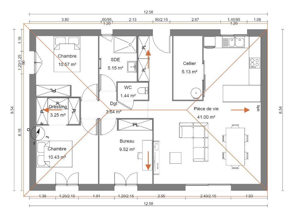 Maison plain pied de 90m2.Profitez d'une grande pièce de vie fonctionnelle et baignée de lumière attenante au cellier/buanderie, un coin nuit avec 2 chambres dont une avec dressing, 1 bureau,1 salle de bain avec grande douche à l'italienne, 1 WC séparé.