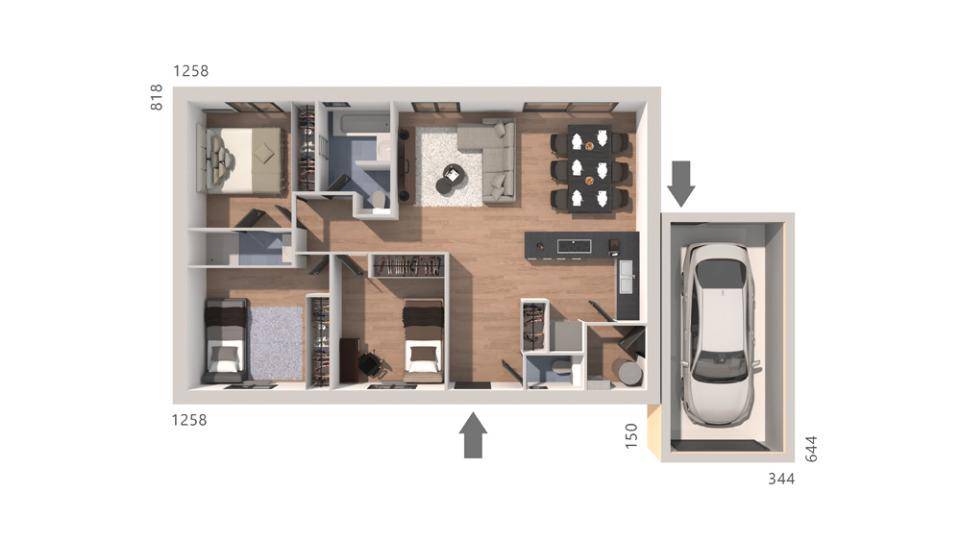 Elle dispose de trois chambres, d'une cuisine et d'une salle de bains. La maison est neuve.