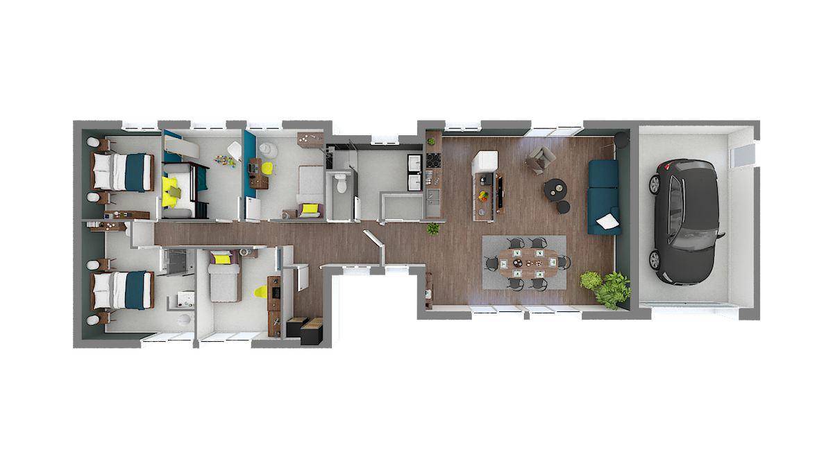 Nous vous proposons cette maison neuve, baptisée ""Hilya"", un modèle d'exception qui allie avec brio charme et modernité. Conçue par un architecte, cette maison en L se distingue par son design contemporain, marqué par un toit plat élégant et un garage accolé, intégré harmonieusement à l'ensemble. Avec une surface habitable de 109 m², elle offre un espace de vie optimal réparti en 4 pièces, dont 4 chambres confortables, répondant ainsi parfaitement aux besoins d'une famille moderne.