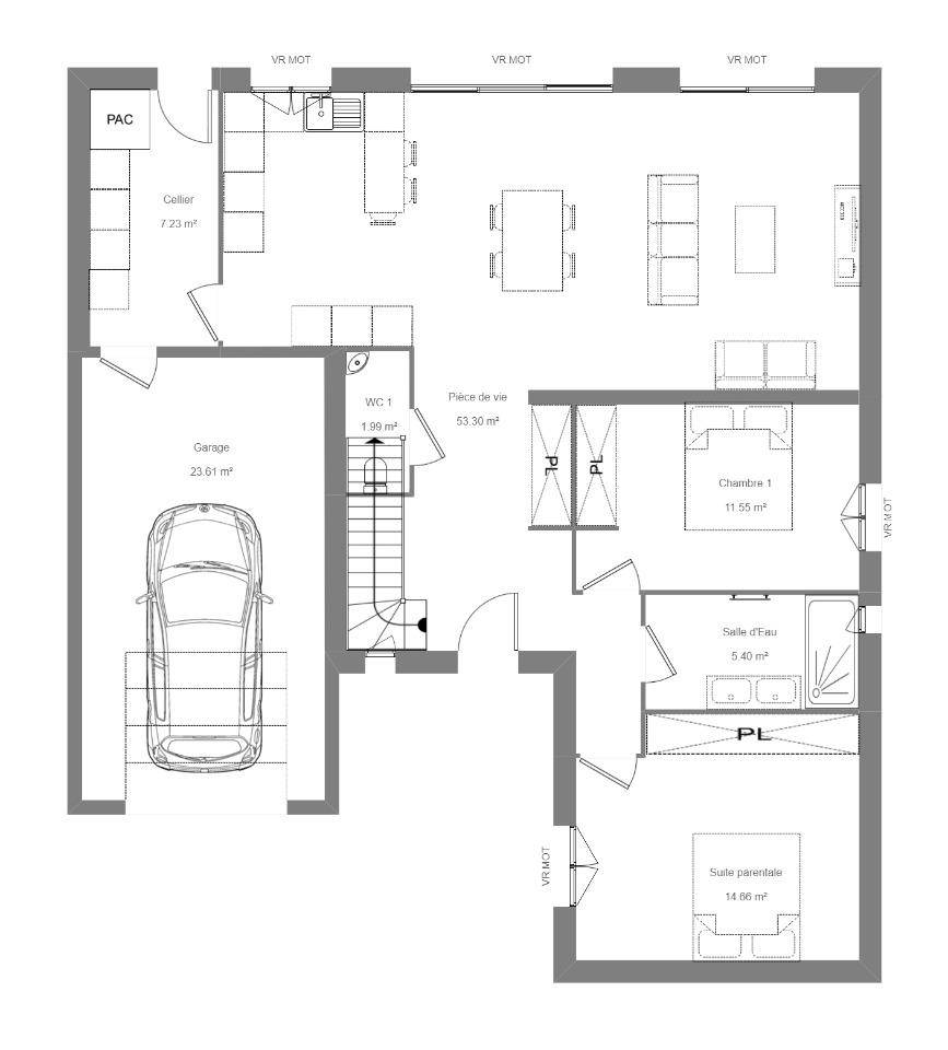 Concernant les prestations de la maison, vous retrouverez une pompe à chaleur couplée avec un plancher chauffant, des menuiseries de couleur en aluminium, un plancher béton, des ardoises artificielles, gerbière, porche en toit plat...