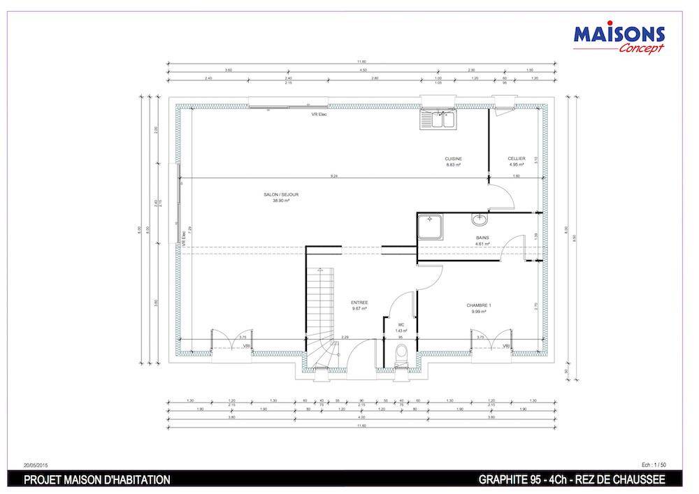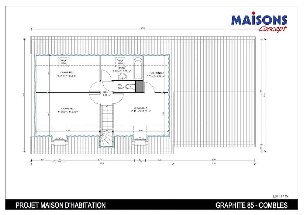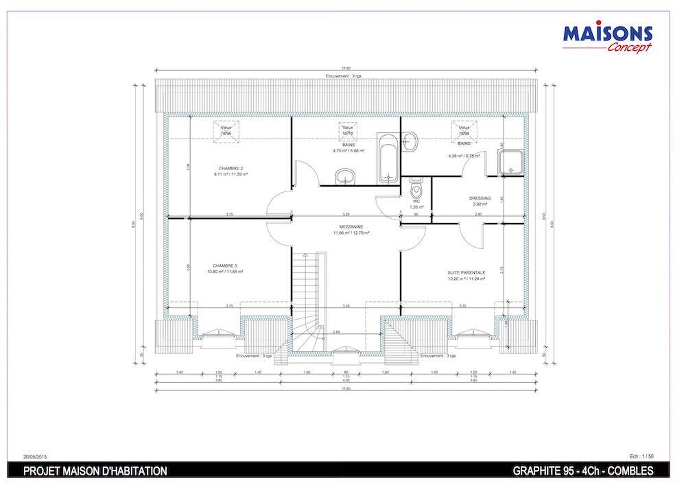La ""Graphite"" est composée de 4 chambres réparties intelligemment pour garantir l'intimité de chacun, et de 4 pièces conçues pour maximiser l'espace de vie commun. La dalle de l'étage en béton assure une solidité et une isolation phonique de qualité, tandis que les combles aménagés offrent un espace supplémentaire, idéal pour une salle de jeux, un bureau ou une chambre d'amis.