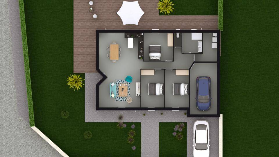 Maison de plain pied rectangulaire avec son décroché. vous accueille avec son grand espace à vivre de 40m2. Une cuisine en L ouverte et bien pensée