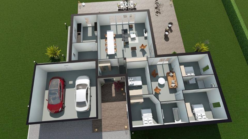 Son intérieur dispose de quatre chambres, d'une cuisine et de deux salles de bains. Cette maison est neuve.