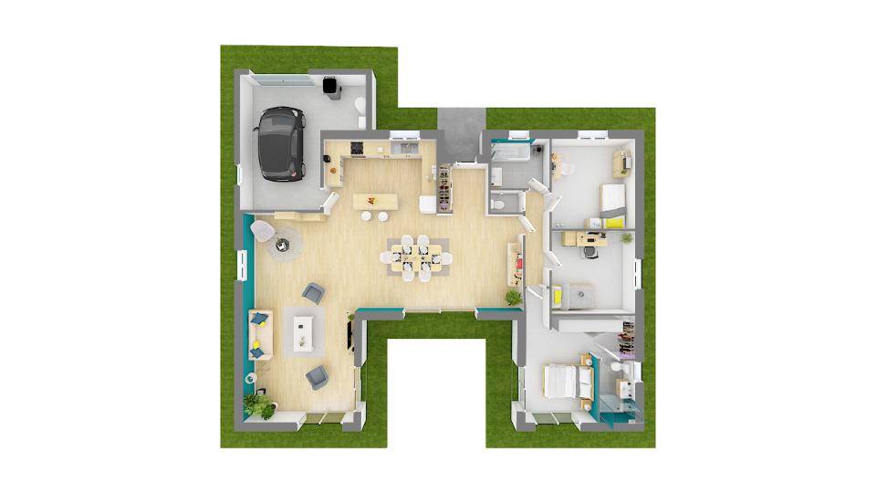 Conçue de plain-pied, elle est composée de trois chambres, d'une cuisine et de deux salles de bains. Cette maison est neuve.