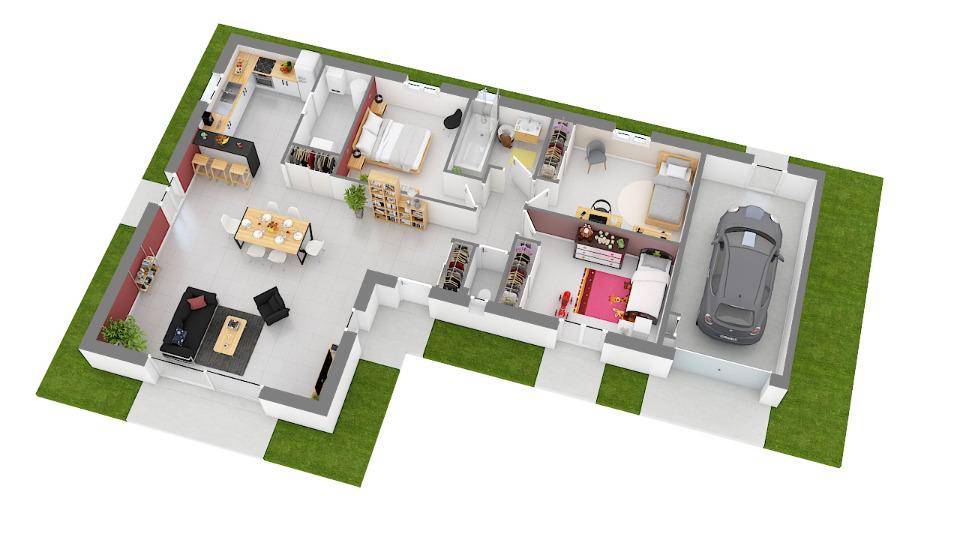 Conçue de plain-pied, elle offre trois chambres, une cuisine et une salle de bains. Cette maison est neuve.