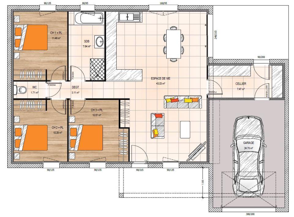 TERRAIN ET MAISONSur ce terrain, nous vous proposons cette superbe maison de plain-pied au plan optimisé, pensée pour offrir confort et convivialité à toute la famille. Passé l’entrée, vous serez immédiatement séduit par une vaste pièce de vie baignée de lumière, où se côtoient salon, salle à manger et cuisine ouverte, idéale pour partager des moments chaleureux au quotidien.Côté nuit, trois chambres spacieuses et lumineuses vous attendent, chacune permettant d’installer rangements et bureau selon vos envies. Une salle de bain moderne, un WC complètent cet agencement astucieux, facilitant l’organisation de la vie de famille.Atout pratique : Un garage attenant de près de 21 m² permet de stationner votre véhicule en toute sécurité, tout en laissant de la place pour un atelier ou du rangement supplémentaire.Moderne, fonctionnelle et pensée pour un confort optimal, cette maison saura répondre à toutes vos attentes. N’attendez plus pour venir la découvrir et laissez-vous séduire par son agencement harmonieux !