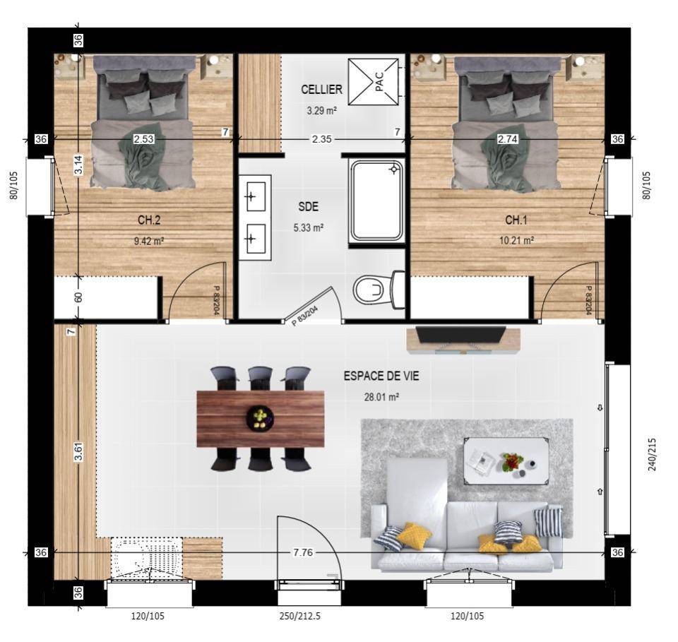 TERRAIN ET MAISONTerrain constructible de 420 m², bien situé et proche des commodités. Parcelle bien orientée, offrant un cadre agréable pour concevoir votre future maison. Agréable et lumineuse, cette maison de plain-pied vous propose une cuisine ouverte sur un vaste séjour traversant de 47 m² environ. L'accès direct cuisine, cellier et garage facilite l'habitabilité de cette maison. L'espace nuit est composé de deux belles chambres avec rangement, d'une salle de bains et des wc séparés. Ses jeux d'enduits personnalisables sauront vous séduire. . Pour vous assurer un confort de vie et conformément à la RE2025, nous avons choisi un mode de chauffage par PAC + plancher chauffant, volets roulants électriques. Prix hors fourniture et pose : des appareils sanitaires (sauf système de chauffage et d'eau chaude sanitaire), du carrelage et de la faïence, des revêtements de sol dans les chambres. Hors décoration et aménagement intérieur et peinture. Hors raccordements, frais de notaire et dommage ouvrage. // Réf. : 1065-213638-SAP. Prix terrain : 50 400 €, hors frais d'agence à la charge de l'acquéreur. Ce terrain vous est proposé, par nos partenaires fonciers, dans le cadre d'un projet de construction avec nous. Les informations sur les risques auxquels ce bien est exposé sont disponibles sur le site Géorisques (www.georisques.gouv.fr). Prix maison : 127 774 €.
