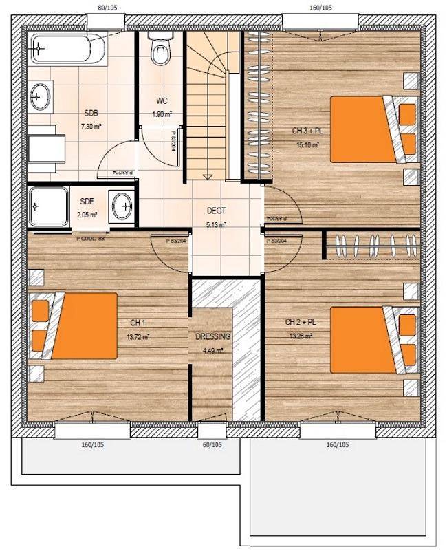 Proche d'Angers -  Maison neuve 5 pièces à vendre à Daumeray (49640) avec 2 niveaux, une surface de 120 m² sur un terrain de 615 m². Son intérieur se divise en trois chambres, une cuisine et une salle de bains.