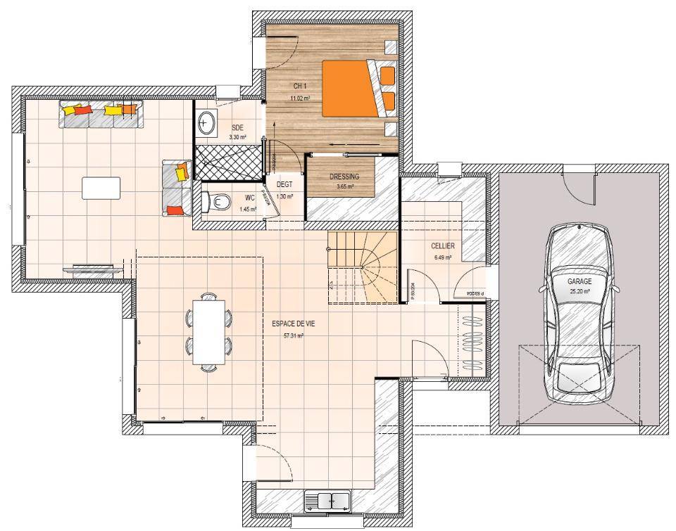 TERRAIN ET MAISONNous vous proposons cette maison neuve, baptisée « »Élégance » », un modèle qui se distingue par sa forme architecturale en L, offrant à la fois style et fonctionnalité. Avec une surface habitable de 78 m², cette maison de plain-pied est conçue pour optimiser l’espace et la lumière naturelle, créant ainsi un cadre de vie à la fois confortable et esthétique.L’Élégance se compose de 3 pièces principales, dont 2 chambres spacieuses, promettant un espace de vie idéal pour une petite famille ou un couple. Le grand salon-séjour, cœur de la maison, s’ouvre sur une cuisine moderne et entièrement équipée, formant un espace ouvert parfait pour les moments de partage et de convivialité. Un garage intégré, accessible depuis l’intérieur de la maison, ainsi qu’un cellier pratique, ajoutent à la fonctionnalité de ce modèle.Cette maison est personnalisable selon vos désirs et besoins, vous permettant de créer un intérieur qui vous ressemble. Que vous rêviez d’une salle de bain supplémentaire, d’un bureau ou d’une chambre d’amis, l’Élégance s’adapte à votre mode de vie.L’une des caractéristiques les plus appréciées de ce modèle est son enduit bi-ton, qui lui confère une allure moderne et élégante, soulignant ainsi son architecture unique. Mais ce qui distingue véritablement l’Élégance, c’est son engagement envers l’environnement. Cette maison est conçue pour être basse consommation et répond aux exigences de la norme RE2020, garantissant ainsi une efficacité énergétique optimale et une réduction significative de votre empreinte carbone.En choisissant l’Élégance, vous optez pour une maison qui allie esthétique, confort et respect de l’environnement. Une opportunité à ne pas manquer pour ceux qui cherchent à investir dans un bien immobilier durable et de qualité.