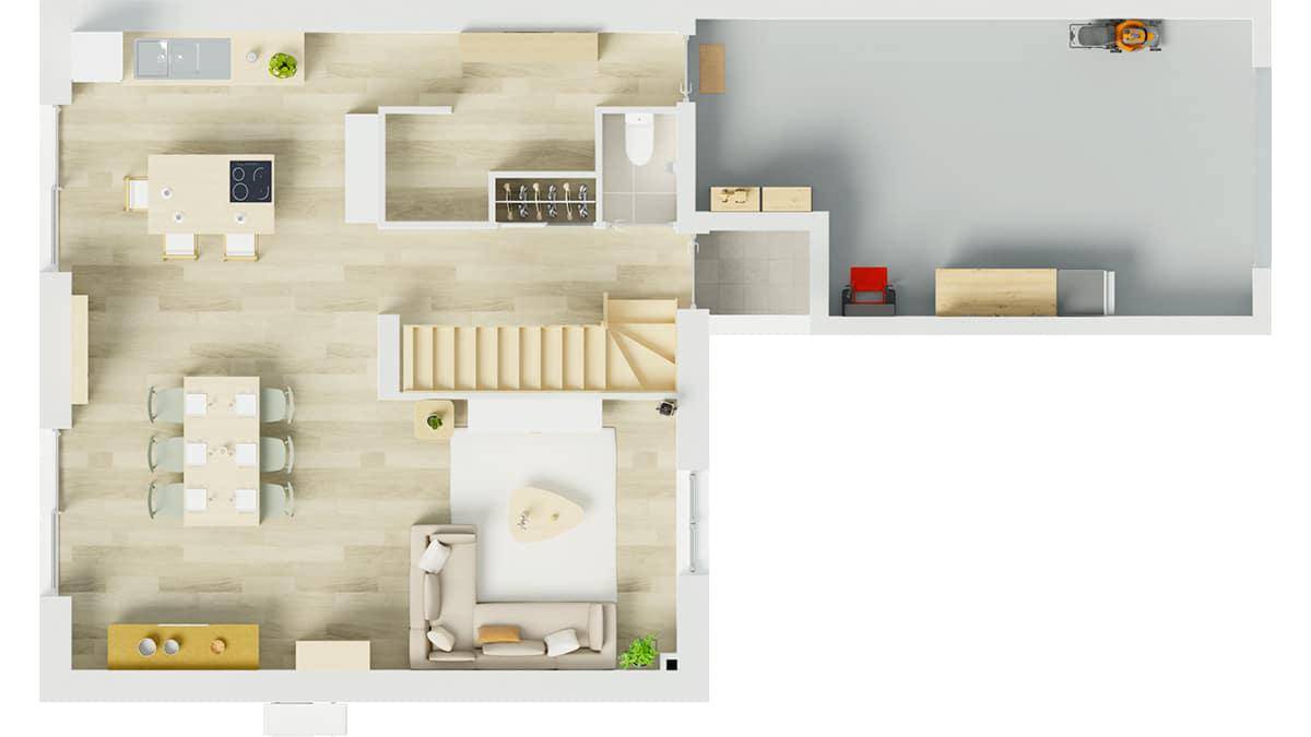 Sur ce terrain, nous vous proposons la maison Focus Urban 80, un modèle à étage compact et moderne parfaitement adapté aux parcelles urbaines. Avec ses 80 m² habitables, cette maison neuve offre une belle pièce de vie ouverte et lumineuse au rez-de-chaussée, trois chambres bien agencées à l'étage, ainsi qu’un garage intégré pour plus de confort au quotidien.