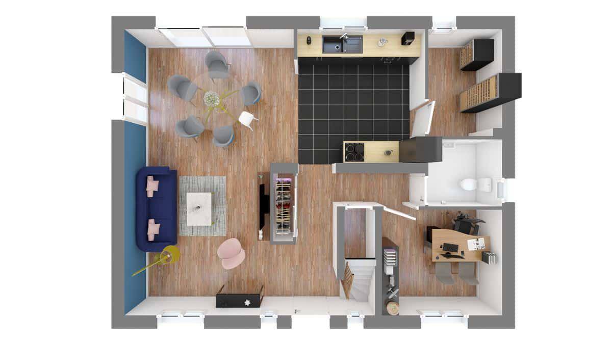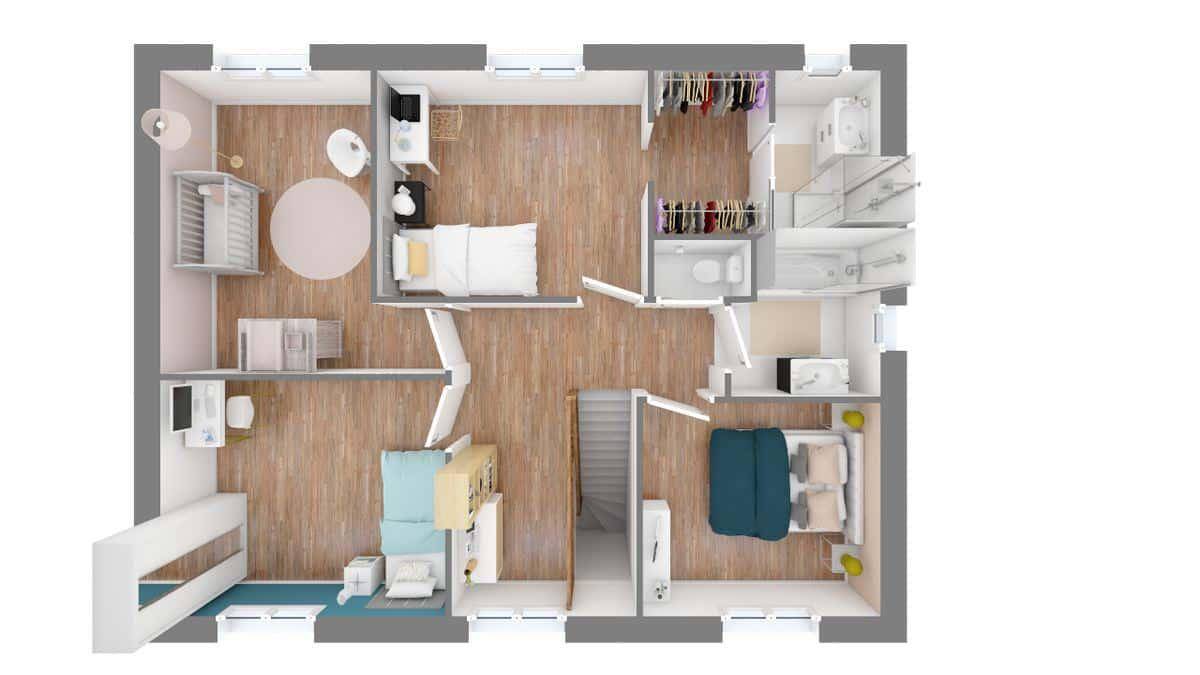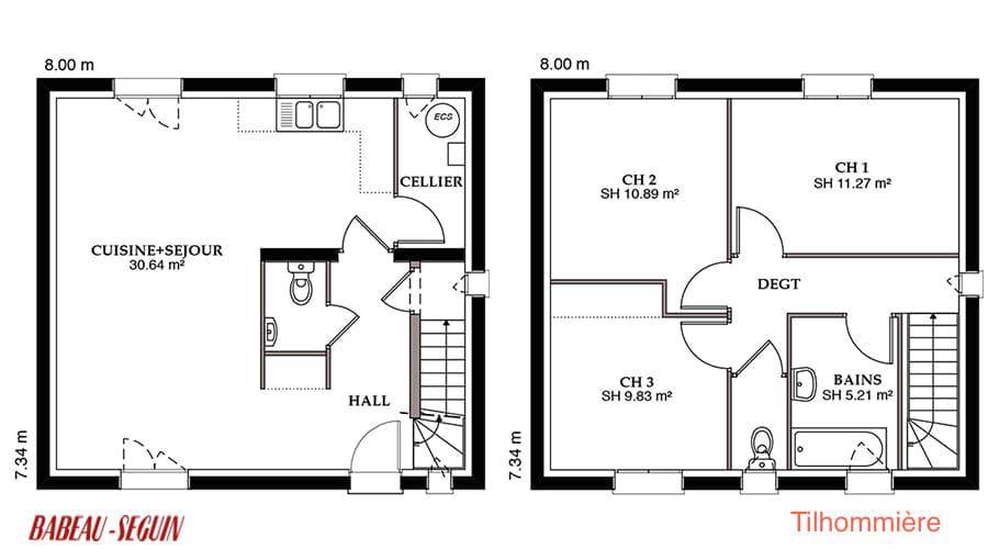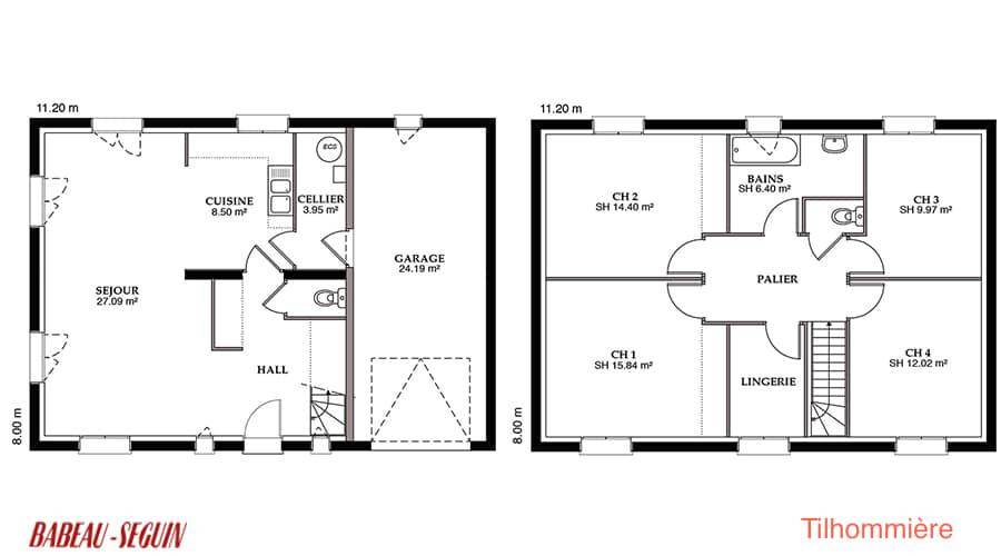 Avec une surface de 120 m², la Tilhommière sud se compose de 4 chambres et de 4 pièces, réparties sur deux niveaux (R+1) avec une dalle étage en béton. Les pièces de jour sont situées au rez-de-chaussée, tandis que les chambres se trouvent à l'étage, faisant de cette maison une digne représentante des demeures familiales du catalogue Babeau-Seguin.