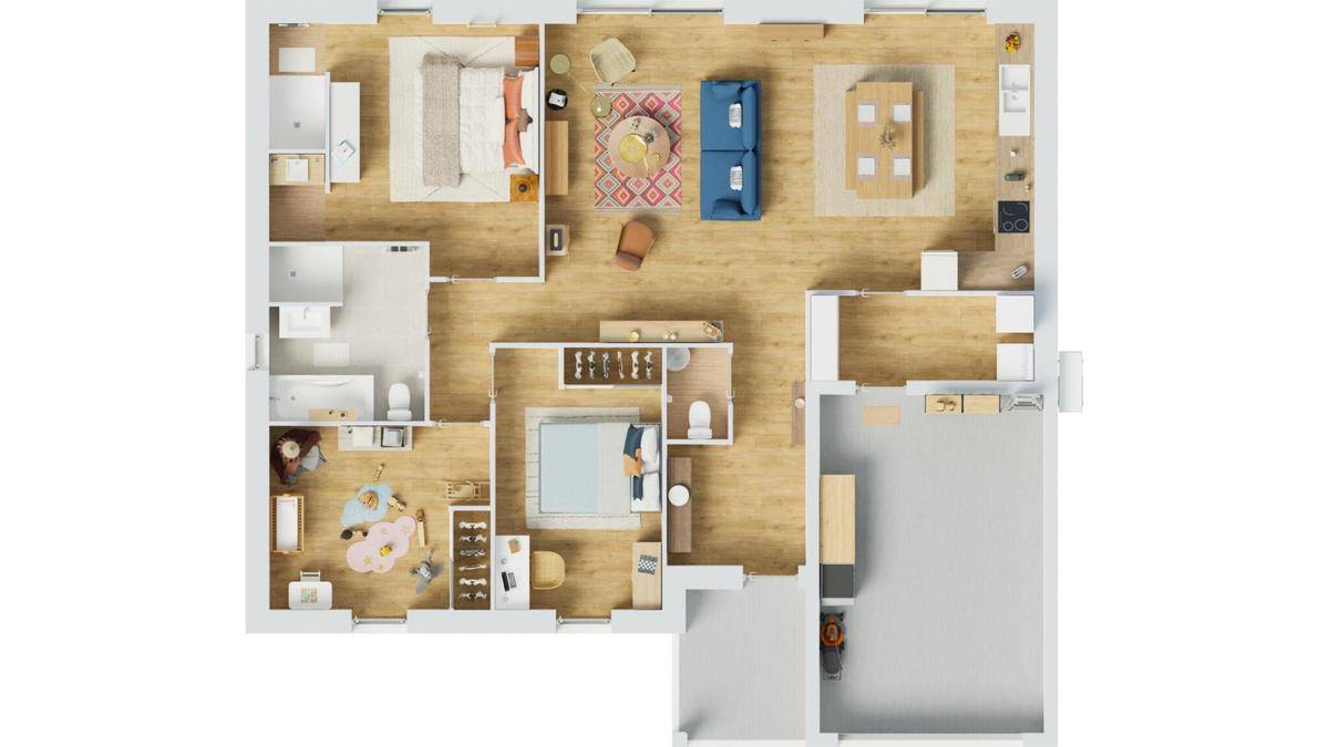 La Verdania se distingue par son architecture en L et sa toiture à 4 pans, offrant une allure moderne et élégante. Dès l’entrée, un porche accueillant vous invite à découvrir un intérieur spacieux et lumineux. Le grand séjour, baigné de lumière grâce à ses baies coulissantes, est le cœur de cette maison, idéal pour des moments conviviaux en famille.