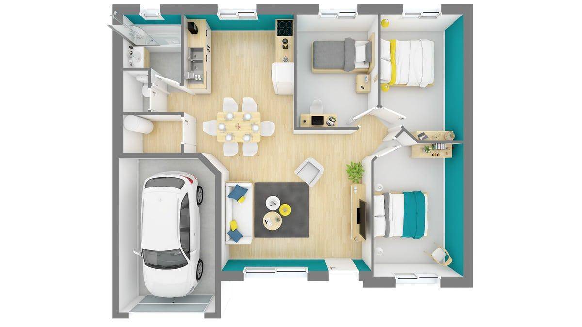 La Focus Tiny est une habitation traditionnelle de plain-pied avec un garage intégré de 15 m². Elle se distingue par son design sobre et moderne, ainsi que par ses excellentes performances en matière d'économie d'énergie, conforme à la norme RE2020. Cette maison basse consommation est parfaite pour ceux qui souhaitent réduire leur empreinte écologique tout en bénéficiant d'un confort optimal.
