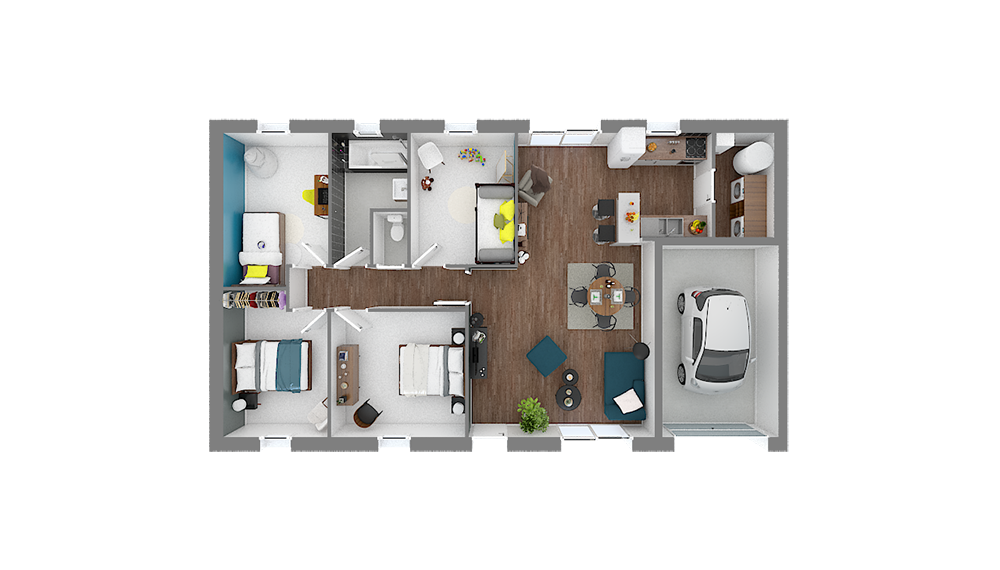 Avec une surface habitable de 89 m², la Focus Family vous offre un espace généreux et bien agencé. Elle comprend 4 chambres, parfaites pour accueillir toute votre famille, ainsi qu'un grand séjour traversant avec cuisine ouverte, pour un total de 4 pièces. Vous apprécierez également le garage intégré, pratique pour stationner votre véhicule ou pour du rangement supplémentaire.