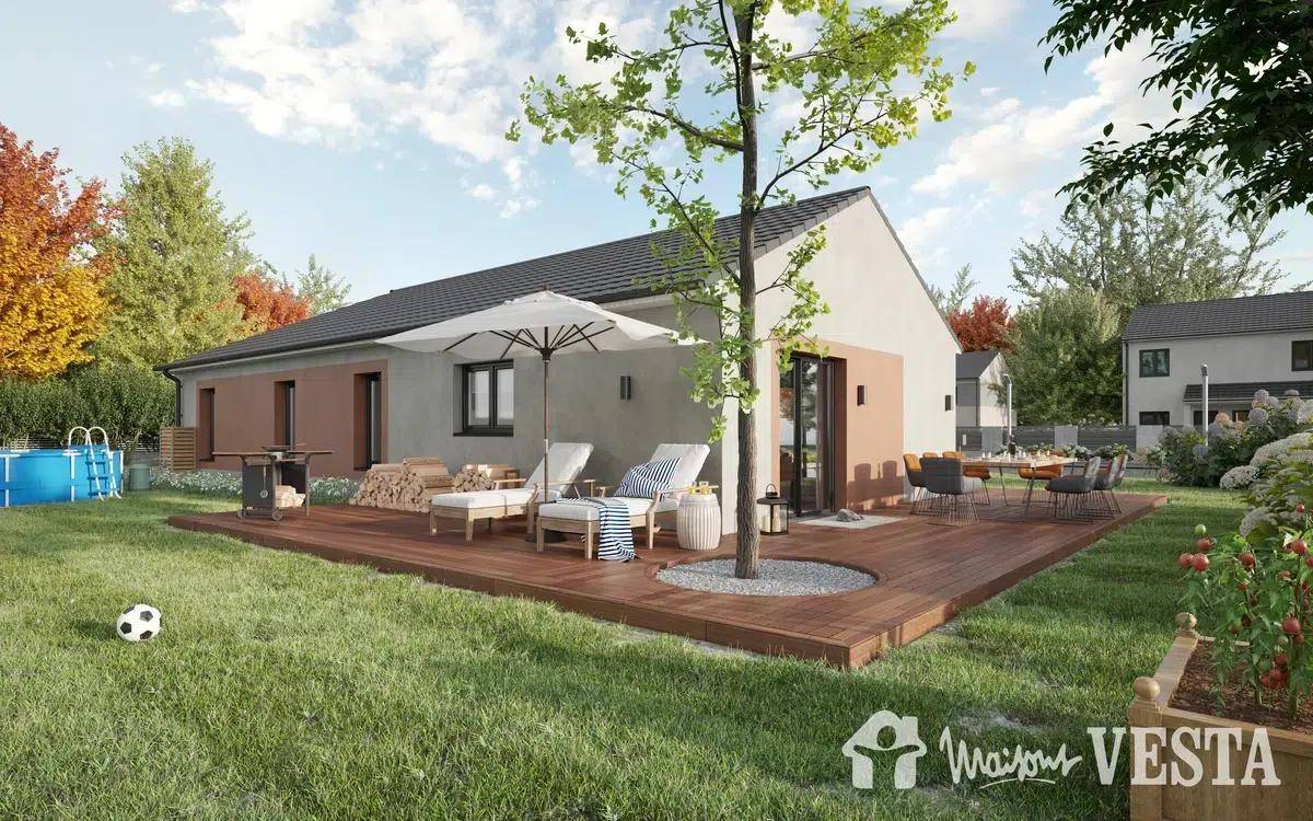TERRAIN ET MAISONSur ce terrain, nous vous proposons cette maison neuve : la My First 75, un modèle idéal pour les familles à la recherche d’un logement à petit prix. Conçue par Maisons Vesta, cette maison de 75 m² offre 4 pièces, dont 3 chambres, et se distingue par ses excellentes performances énergétiques conformes à la norme RE2020.La My First 75 est la championne toutes catégories de notre gamme low cost ! C’est en effet la maison la moins chère, tout simplement ! Quand simplicité et qualité riment avec meilleur prix, cela donne une jolie habitation traditionnelle de plain-pied avec garage intégré, très sympa et affichant d’excellentes performances en matière d’économie d’énergie (RE2020), ce qui est indispensable à l’heure actuelle. Même avec un budget serré, votre projet se réalisera avec Maisons Vesta !Ce joli petit pavillon dispose d’un garage de 15m². Quant à sa surface habitable, elle est de 75m². Un grand séjour-cuisine traversant donne une agréable sensation d’espace. Trois chambres à coucher de dimension raisonnable accueilleront votre famille ! Le design sobre et moderne tout à la fois en fait un modèle très apprécié de nos clients.Fonctionnelle, elle a une petite surface, mais des espaces si bien répartis qu’on est loin de se sentir à l’étroit. La My First 75 a vraiment tous les arguments pour séduire le plus exigeant de nos clients ! Visitez-la en 3D sur notre site !Pour un prix défiant toute concurrence, vous bénéficiez de nos meilleures technologies et d’un service sans failles ! Soyez-en assuré, son tout petit prix ne vous privera pas d’une maison bien isolée, aux finitions soignées, dans laquelle vous et votre famille vous sentirez vraiment chez vous !Cette My First est prête à construire… et ce au meilleur prix. Ne manquez pas cette opportunité unique de devenir propriétaire d’une maison neuve, basse consommation et conforme à la RE2020, avec Maisons Vesta.