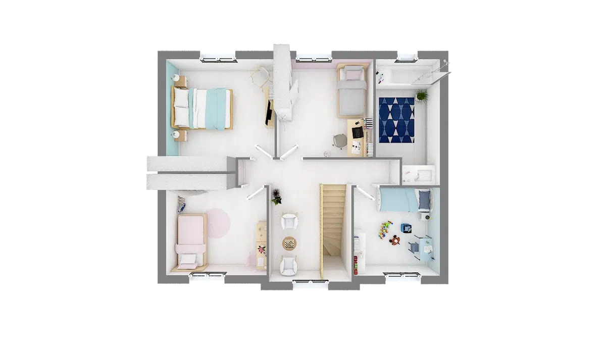 L'étage de la maison BAHAMAS est tout aussi bien pensé, avec quatre chambres allant de 10 à 13 m², permettant à chaque membre de la famille de bénéficier de son propre espace personnel, ou d'accueillir confortablement vos invités. La salle de bains, spacieuse de plus de 8 m², est conçue pour faciliter le quotidien des familles actives, complétée par un second WC indépendant pour une meilleure fonctionnalité.
