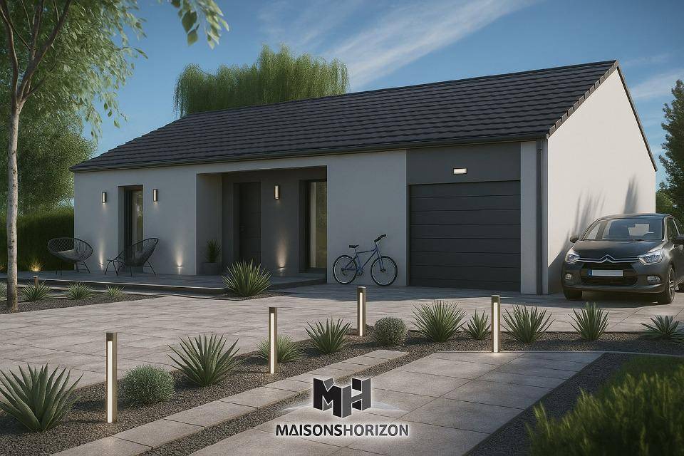 TERRAIN ET MAISONSur ce terrain, nous vous proposons cette maison neuve : la My First 75, un modèle idéal pour les familles à la recherche d’un logement à petit prix. Conçue par Maisons Vesta, cette maison de 75 m² offre 4 pièces, dont 3 chambres, et se distingue par ses excellentes performances énergétiques conformes à la norme RE2020.La My First 75 est la championne toutes catégories de notre gamme low cost ! C’est en effet la maison la moins chère, tout simplement ! Quand simplicité et qualité riment avec meilleur prix, cela donne une jolie habitation traditionnelle de plain-pied avec garage intégré, très sympa et affichant d’excellentes performances en matière d’économie d’énergie (RE2020), ce qui est indispensable à l’heure actuelle. Même avec un budget serré, votre projet se réalisera avec Maisons Vesta !Ce joli petit pavillon dispose d’un garage de 15m². Quant à sa surface habitable, elle est de 75m². Un grand séjour-cuisine traversant donne une agréable sensation d’espace. Trois chambres à coucher de dimension raisonnable accueilleront votre famille ! Le design sobre et moderne tout à la fois en fait un modèle très apprécié de nos clients.Fonctionnelle, elle a une petite surface, mais des espaces si bien répartis qu’on est loin de se sentir à l’étroit. La My First 75 a vraiment tous les arguments pour séduire le plus exigeant de nos clients ! Visitez-la en 3D sur notre site !Pour un prix défiant toute concurrence, vous bénéficiez de nos meilleures technologies et d’un service sans failles ! Soyez-en assuré, son tout petit prix ne vous privera pas d’une maison bien isolée, aux finitions soignées, dans laquelle vous et votre famille vous sentirez vraiment chez vous !Cette My First est prête à construire… et ce au meilleur prix. Ne manquez pas cette opportunité unique de devenir propriétaire d’une maison neuve, basse consommation et conforme à la RE2020, avec Maisons Vesta.