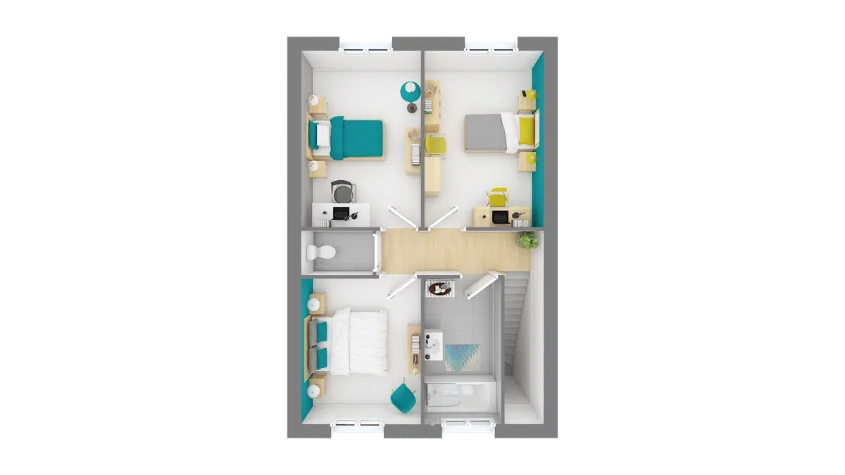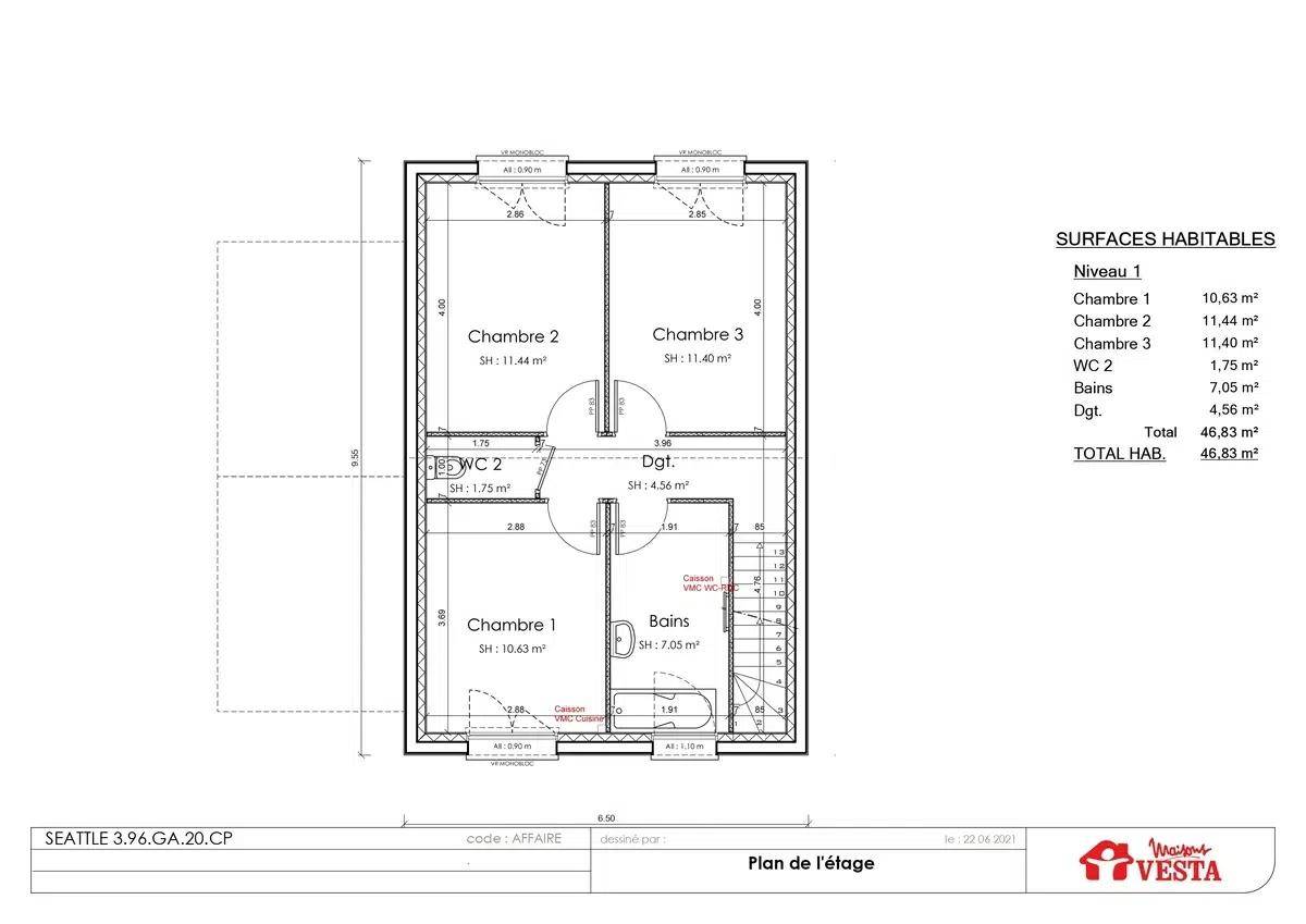 Sur ce terrain, nous vous proposons cette maison neuve : le modèle SEATTLE, conçu par Maisons Vesta. Avec une surface de 81 m², cette maison à étage offre un excellent rapport qualité/prix et s'adapte parfaitement aux terrains avec une façade courte.