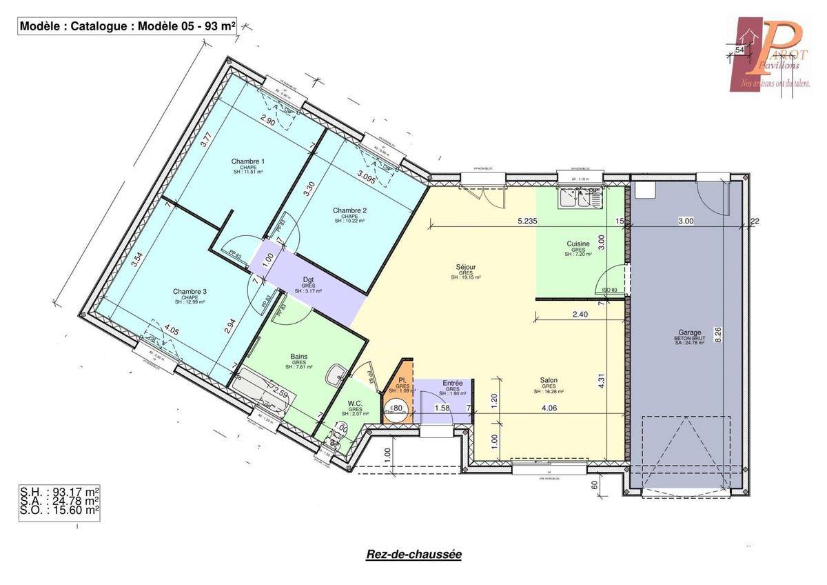 Sur ce terrain, nous vous proposons cette maison neuve, modèle Etoile, construite par Pavillons Parot. Avec une surface de 93 m², cette maison de plain-pied au plan en V sophistiqué s'adapte à pratiquement tous les types de terrains.