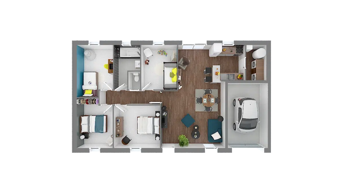 La My First 91 se distingue par son agencement parfaitement optimisé. Elle dispose de quatre chambres spacieuses, chacune de plus de 10 m², offrant ainsi un espace de vie confortable pour chaque membre de la famille. La maison comprend également une grande pièce de vie traversante et lumineuse avec une cuisine ouverte, un cellier attenant, une salle de bain avec baignoire et des WC séparés.