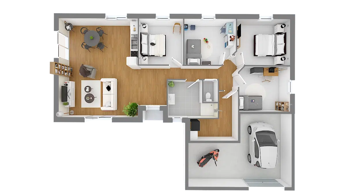 Le modèle MALAGA se distingue par son architecture en L avec une avancée à l'avant, offrant ainsi une discrétion appréciable par rapport à la rue et un espace extérieur plus intime. Le porche d'entrée vous accueille, ajoutant une touche d'élégance à l'ensemble. À l'intérieur, la pièce de vie spacieuse de plus de 40 m² baigne dans la lumière naturelle grâce à ses nombreuses ouvertures sur trois murs, créant un espace de vie chaleureux et accueillant.