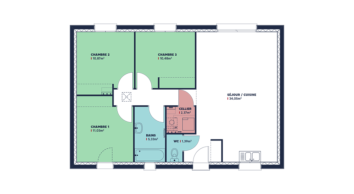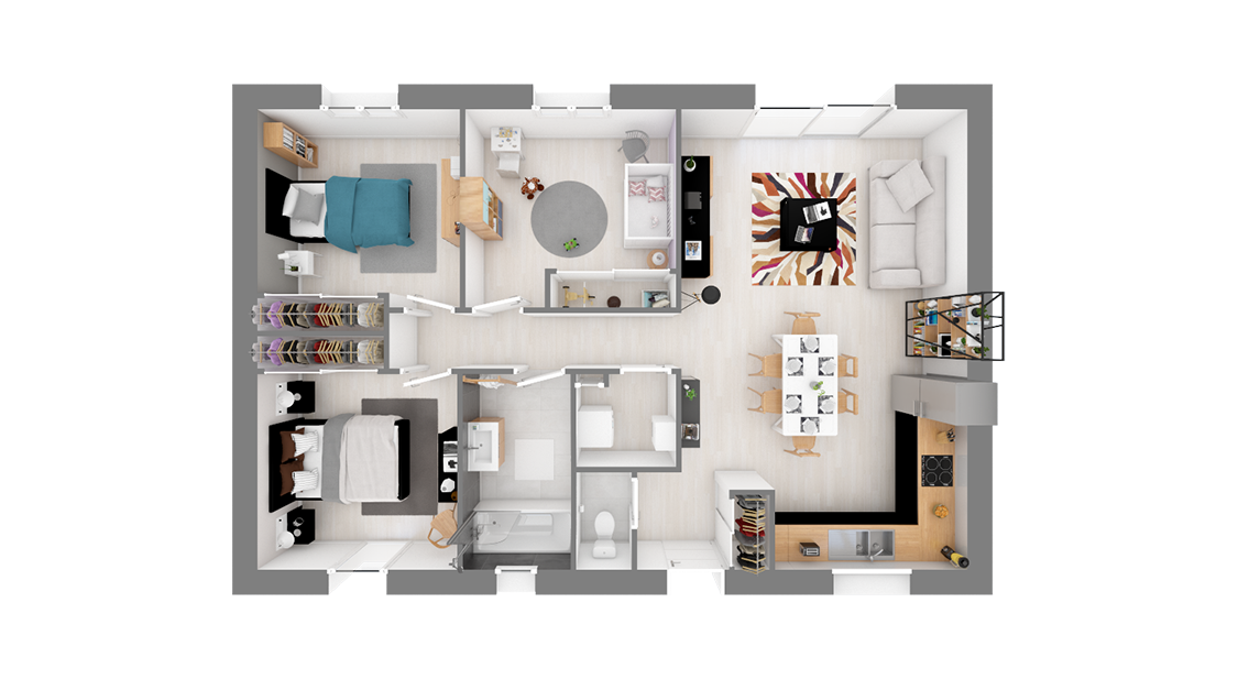 Le modèle Focus 79 SG se distingue par son agencement intelligent et fonctionnel, offrant 4 pièces lumineuses et bien pensées pour un quotidien agréable et harmonieux. L'espace de vie se compose de trois chambres accueillantes, permettant à chaque membre de la famille de bénéficier de son propre espace de tranquillité et de confort. La pièce à vivre, spacieuse et conviviale, est conçue pour être le cœur de la maison, où les moments de partage prennent place.
