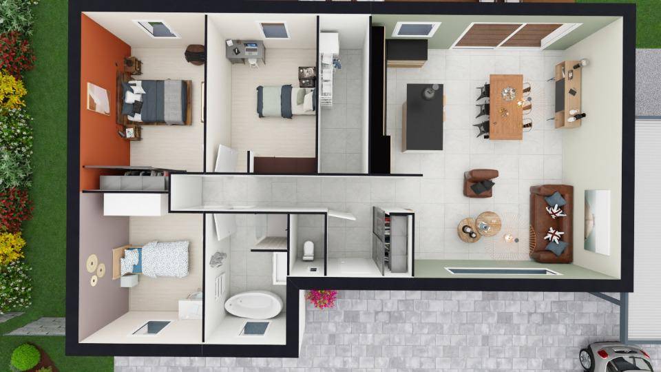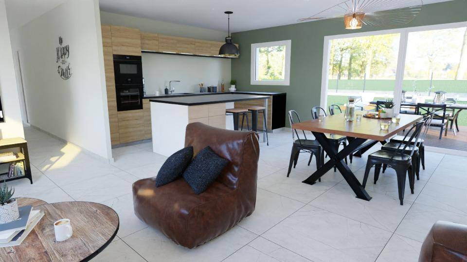 Maison de plain pied en L de 99m2, se composant un espace de vie de 41m2 complétement ouvert et très lumineux parfait pour vos moments de détente et de convivialité, avec cellier attenant à la cuisine, une entrée avec vestiaire et WC, 3 belles chambres et une salle de bains