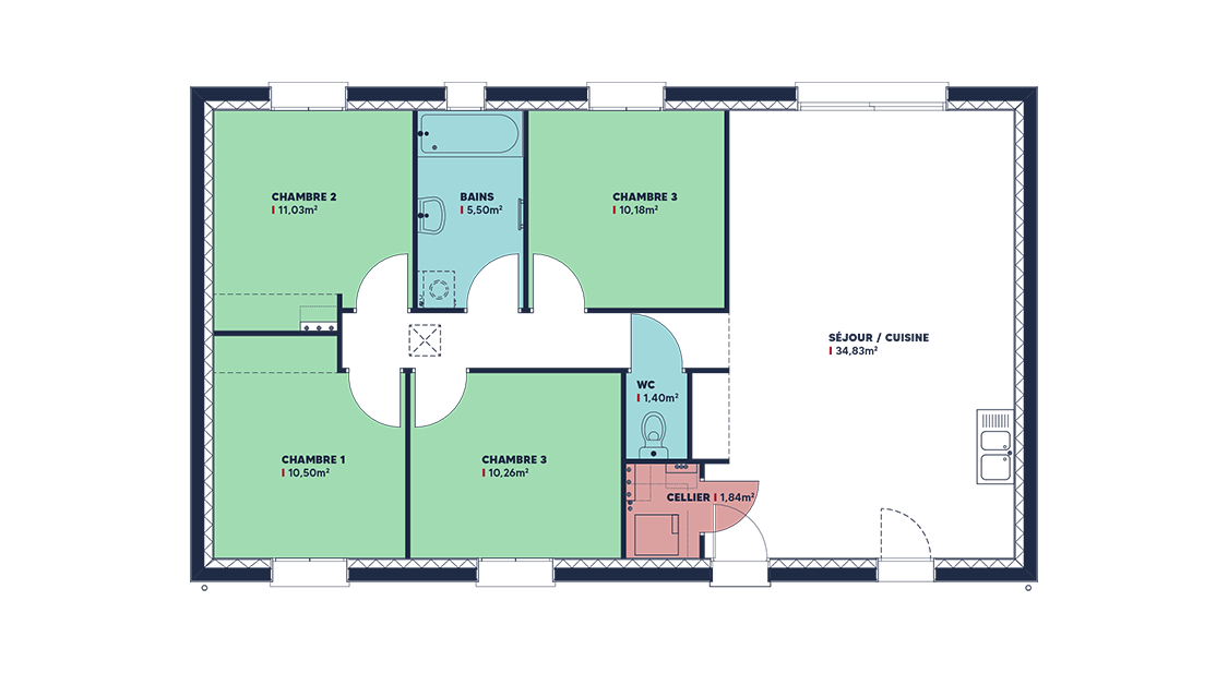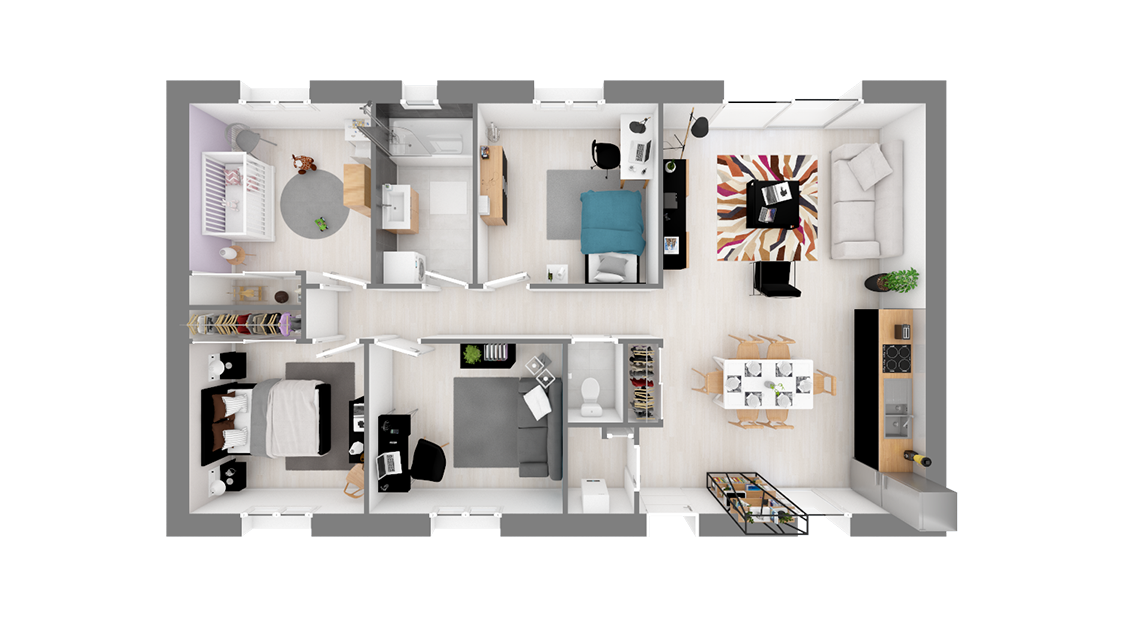 La Focus Family city est une maison lumineuse et écologique, offrant une belle surface habitable de 91 m². C'est l'option idéale pour les familles cherchant une maison de qualité avec une surface confortable pour un budget limité. Respectueuse de la règlementation RE2020 pour l'environnement, elle offre par conséquent un excellent rapport qualité-prix.