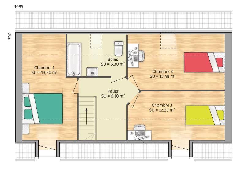 Cette maison compte 2 niveaux. Son intérieur inclut trois chambres, une cuisine et une salle de bains. Cette maison est neuve.