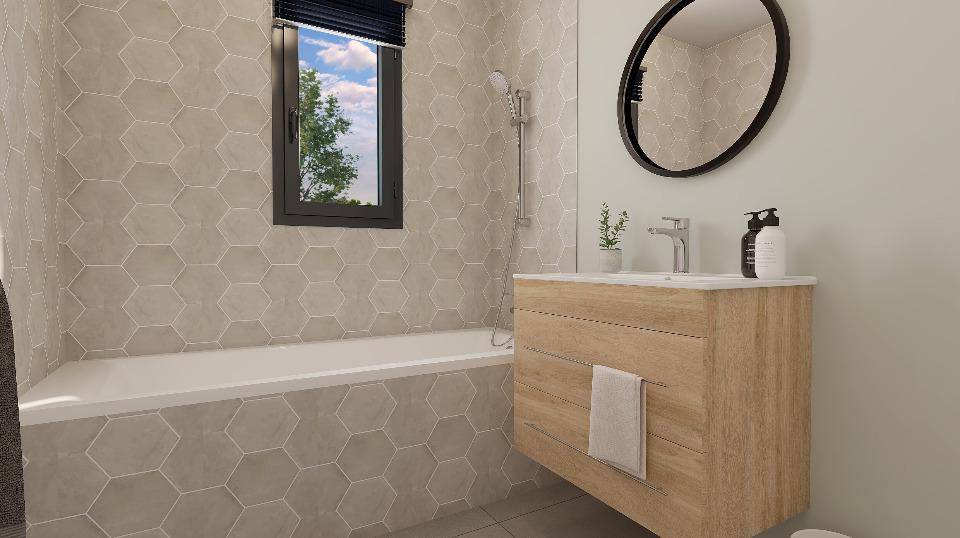 Conçue de plain-pied, elle offre deux chambres, une cuisine et une salle de bains. Cette maison est neuve.