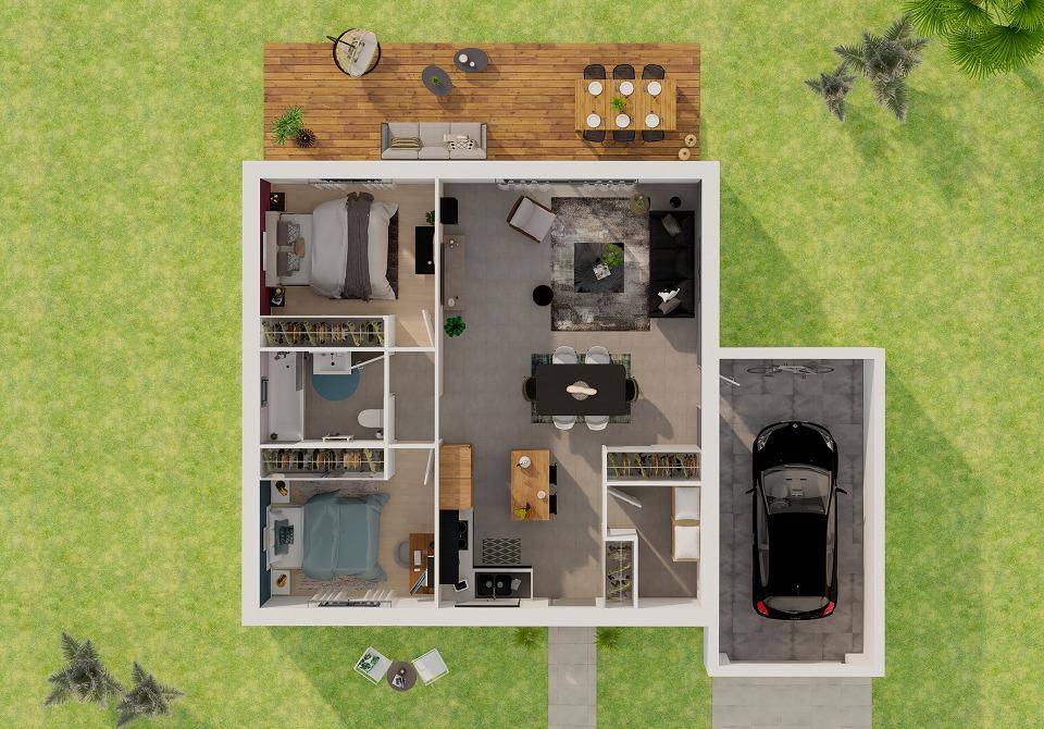 Elle dispose de deux chambres, d'une pièce de vie ouverte et d'une salle de bains. La maison est à construire.