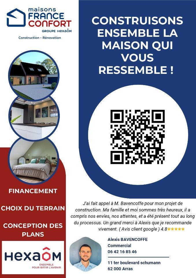 TERRAIN ET MAISONVENTE : maison de 5 pièces (113 m²) à Hauteville OSSATURE BOIS IDÉALEMENT SITUÉE – MAISON 5 PIÈCES NEUVEÀ deux pas d’Arras, notre agence Maisons France Confort Arras est heureuse de vous présenter à vendre, idéalement située dans Hauteville (62810), cette maison de 5 pièces de plain-pied de 113 m². Son intérieur compte quatre chambres, une cuisine et deux salles de bains.Le terrain de la propriété s’étend sur 2 500 m².La maison est neuve.La maison est située dans un quartier recherché. L’École Élémentaire rpi 51 se trouve à moins de 10 minutes à pied. Côté transports en commun, il y a trois gares (Aubigny-en-Artois, Savy-Berlette et Frévin-Capelle) à moins de 10 minutes en voiture. L’autoroute A26 et les nationales N25 et N17 sont accessibles à moins de 17 km. On trouve une boulangerie à proximité.Elle est à vendre pour la somme de 269 854 €.N’hésitez pas à prendre contact avec notre constructeur (Alexis BAVENCOFFE : (Numéro supprimé)) pour toute question sur la maison ou sur les démarches à suivre.