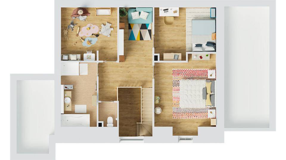 C'est une maison de 2 niveaux. Son intérieur se divise en quatre chambres, une cuisine et deux salles de bains. La maison est neuve.