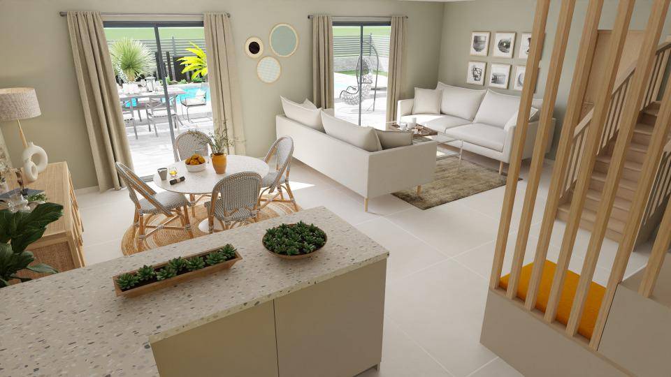 Cette maison de 5 pièces est proposée à l'achat pour 436 000 € (compris étude de sol, études thermiques, plans de permis, raccordements, carrelage, faïence, sanitaires, volets roulants motorisés, climatisation, normes RE 2020). Plans sur mesure.