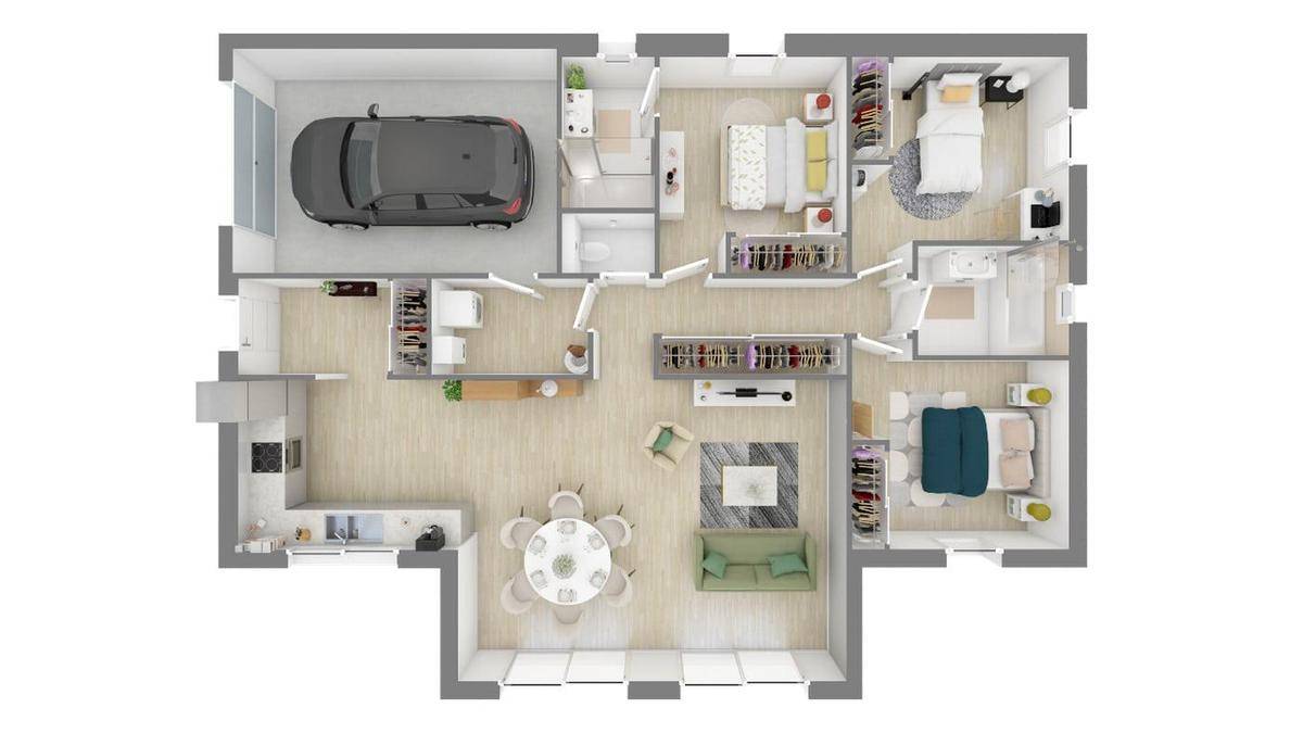 Cette maison est également équipée de deux salles de bains, dont une attenante à la suite parentale, offrant confort et praticité au quotidien. Le garage intégré, accessible depuis l'une des entrées de la maison, est un atout majeur pour les terrains à accès restreint, tout en préservant l'intimité des pièces de vie.