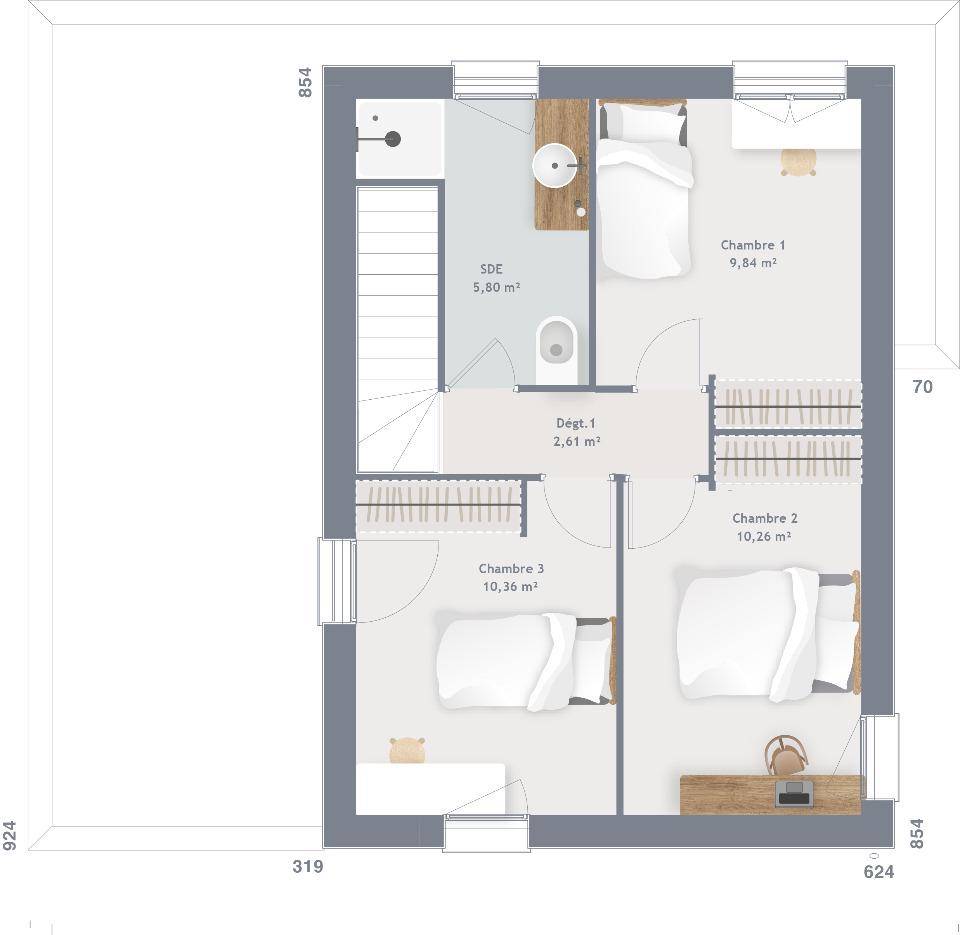 Cette maison comporte 2 niveaux. Elle propose trois chambres, une cuisine et une salle de bains. Cette maison est neuve.