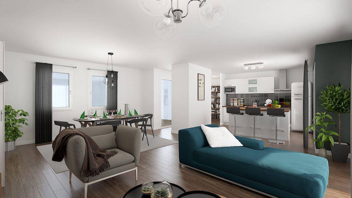 TERRAIN ET MAISONNous vous proposons cette maison neuve, baptisée Futura, une construction qui allie tradition et modernité, conçue spécialement pour répondre aux besoins des familles d’aujourd’hui. Avec une surface habitable de 84 m², cette maison basse consommation est non seulement économique mais aussi respectueuse de l’environnement, conformément aux exigences de la norme RE2020.La Futura se distingue par son excellent rapport qualité/prix, faisant d’elle un choix privilégié pour les primo-accédants. Elle se compose de 4 pièces lumineuses, dont 3 chambres confortables, parfaites pour accueillir une famille. Son agencement intérieur a été pensé pour maximiser l’espace et le confort, offrant ainsi un cadre de vie agréable et fonctionnel.Au cœur de cette maison, vous trouverez un vaste salon de 36 m², jouxtant une cuisine ouverte de 10 m². Cet espace de vie ouvert, d’environ 50 m², est idéal pour partager des moments conviviaux en famille ou entre amis. La maison comprend également un garage intégré de 15 m², accessible via un cellier pratique de 5,5 m², optimisant ainsi l’espace de rangement et la fonctionnalité de la maison.La Futura bénéficie d’une charpente fermette à entraits porteurs 3 appuis, avec une toiture à pente de 45°, et des combles aménagés, offrant ainsi un espace supplémentaire pouvant être personnalisé selon vos besoins et vos envies. Pour répondre aux demandes spécifiques de chacun, la Futura est entièrement personnalisable. Parmi les options les plus prisées, vous pouvez choisir un crépis coloré pour la façade, des menuiseries en aluminium pour une touche moderne et une pergola pour agrémenter votre espace extérieur, créant ainsi un lieu de vie unique qui vous ressemble.Opter pour la Futura, c’est choisir une maison à la fois économique, écologique et confortable, conçue pour s’adapter à votre style de vie et à vos aspirations. Ne manquez pas l’opportunité de construire la maison de vos rêves, une maison où il fait bon vivre, jour après jour.